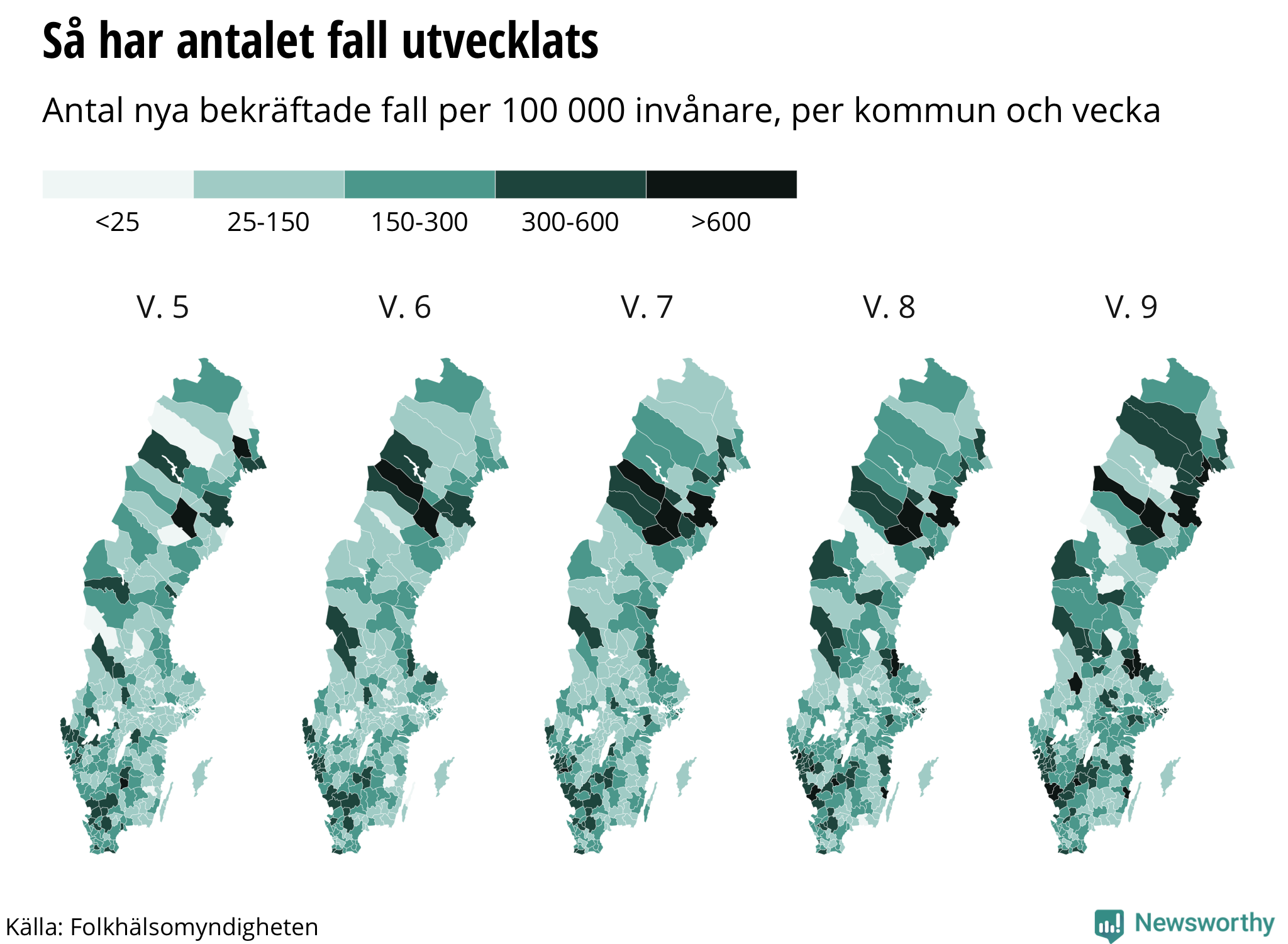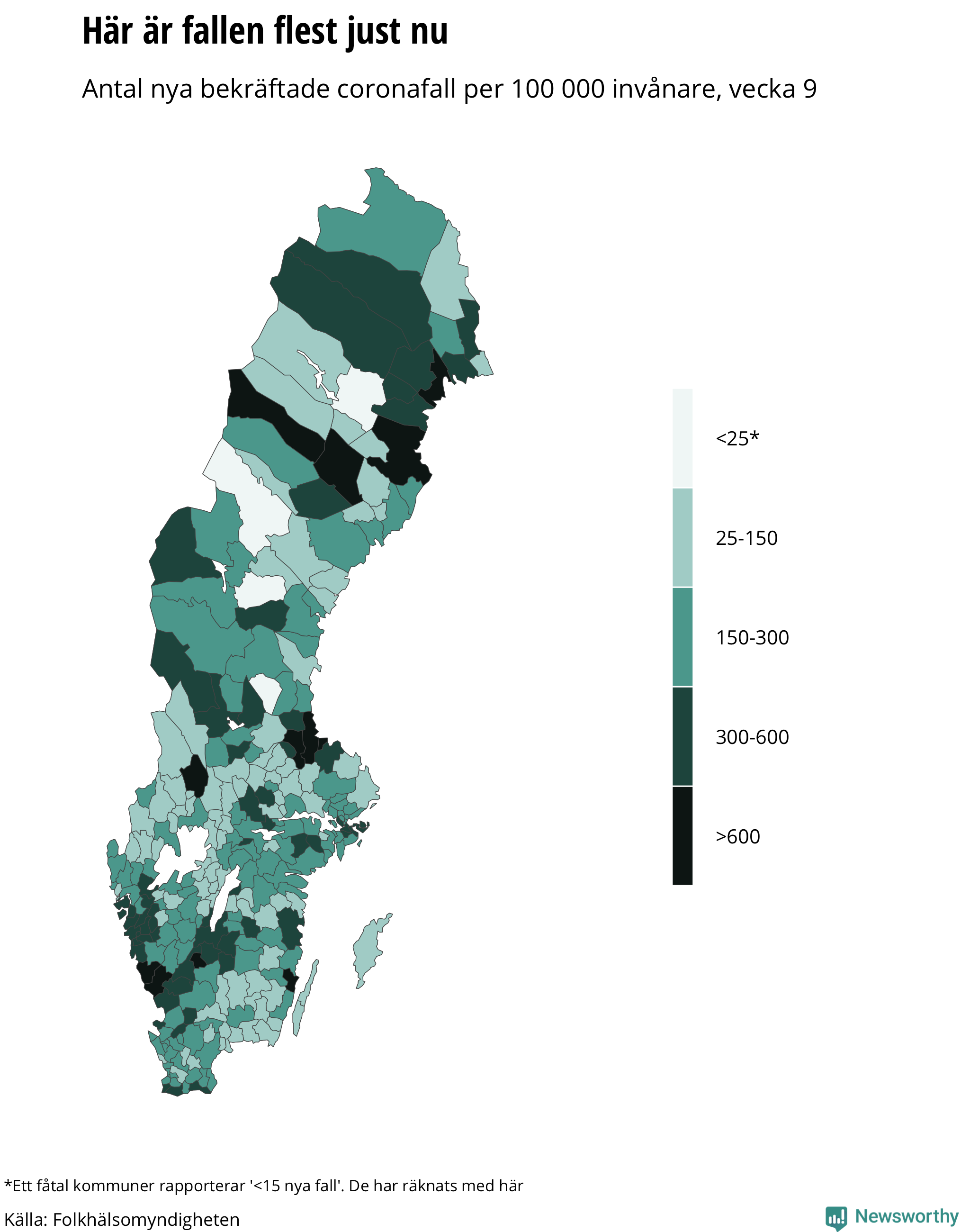 Newsworthy sammanställer varje vecka en rapport om coronaviruset och vaccinering i Sverige, kommun för kommun och län för län, baserat på statistik från Folkhälsomyndigheten.
