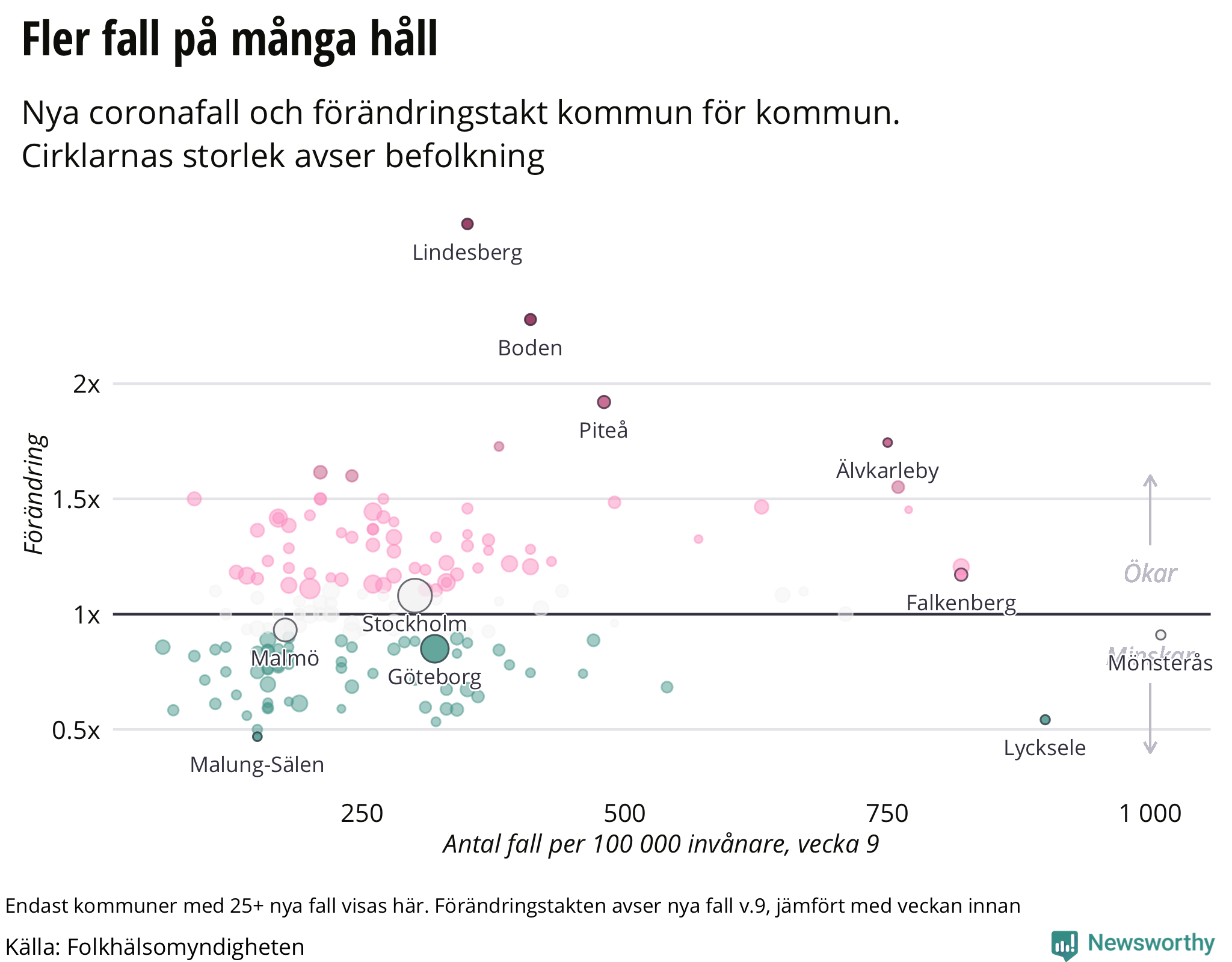 Grafen nedan visar utvecklingen jämfört med veckan innan kommun för kommun, för alla kommuner som rapporterat minst 25 fall.