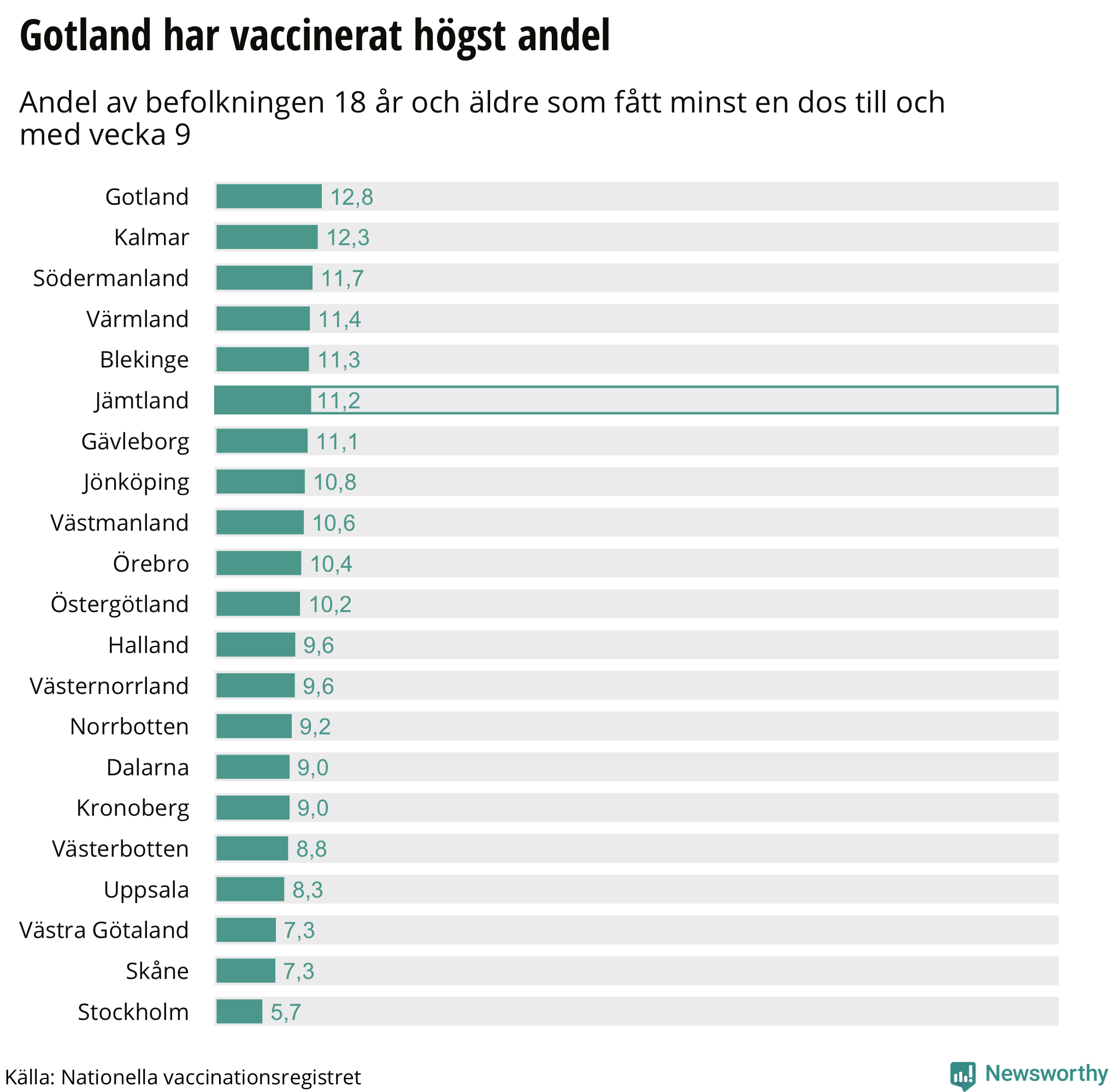 Totalt har 11 741 personer fått sin första vaccindos i Jämtlands län fram till vecka 9.