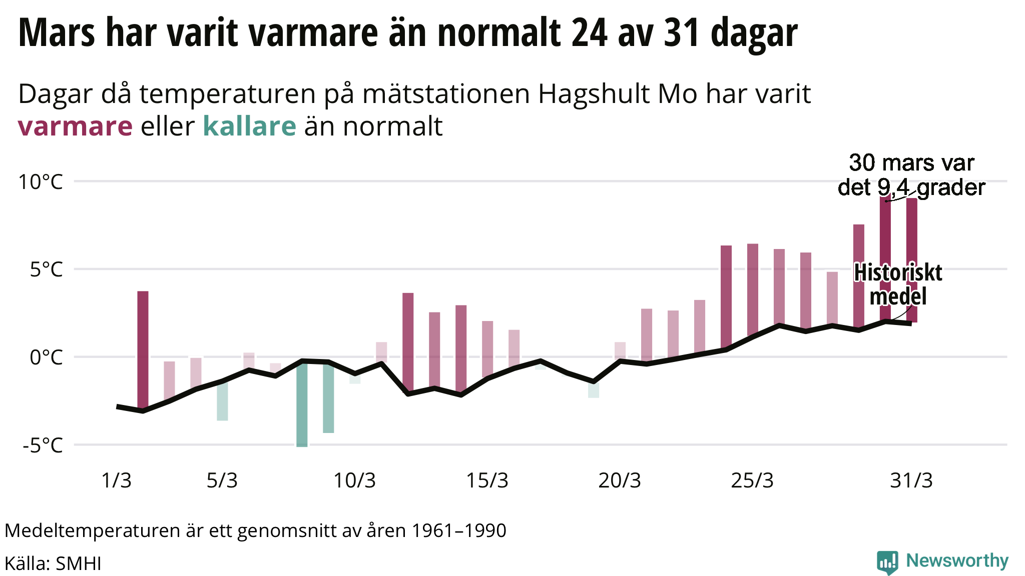 Mars var betydligt mildare än normalt i Värnamo kommun. Under 24 av 31 dagar låg dygnsmedeltemperaturen över det historiska snittet. Den 30 mars stack ut som den 4:e varmaste dagen för månaden på 78 år.