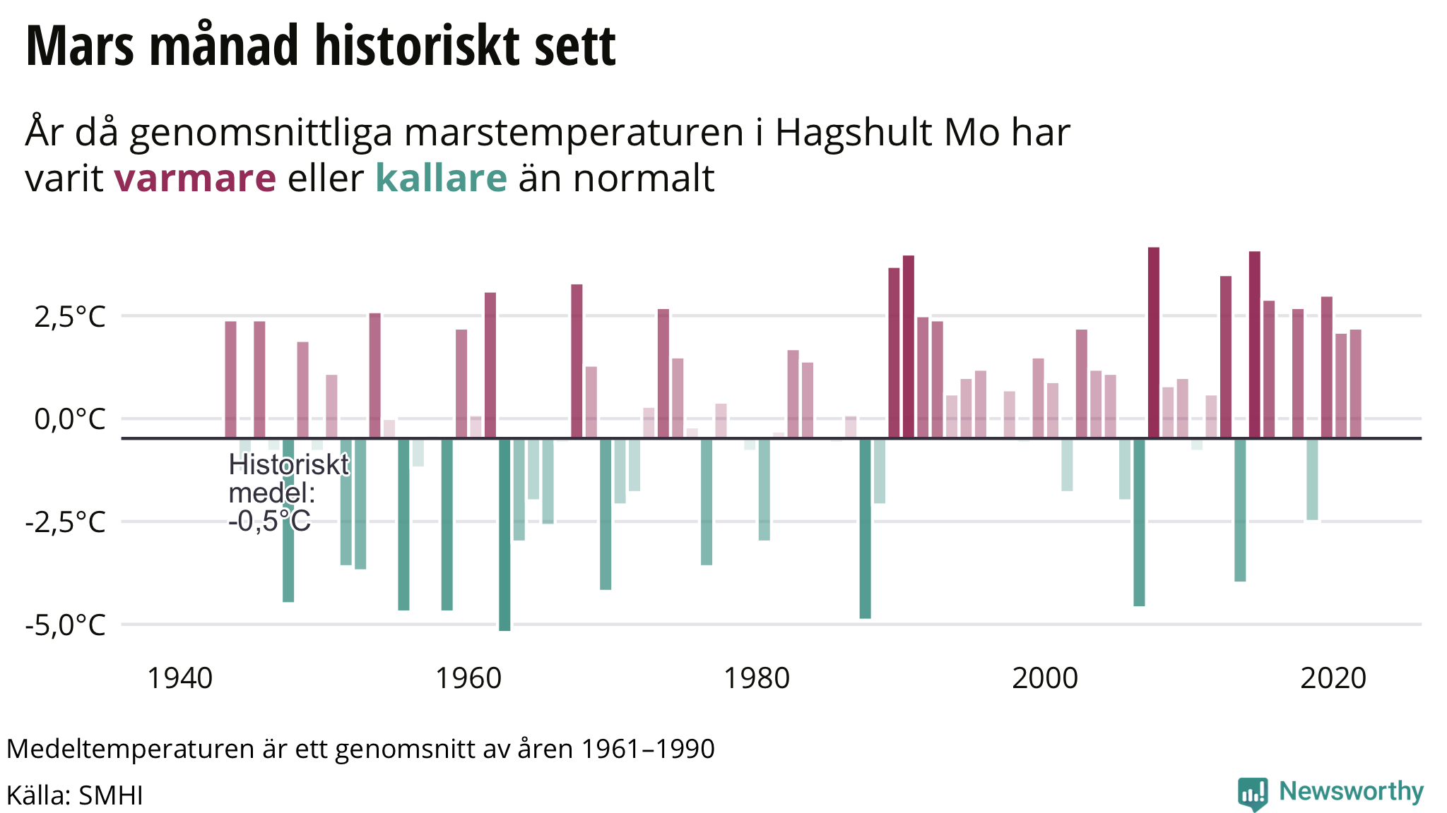 Under mars månad uppmättes en medeltemperatur på +2,2 grader vid mätstationen Hagshult Mo i Värnamo kommun.
