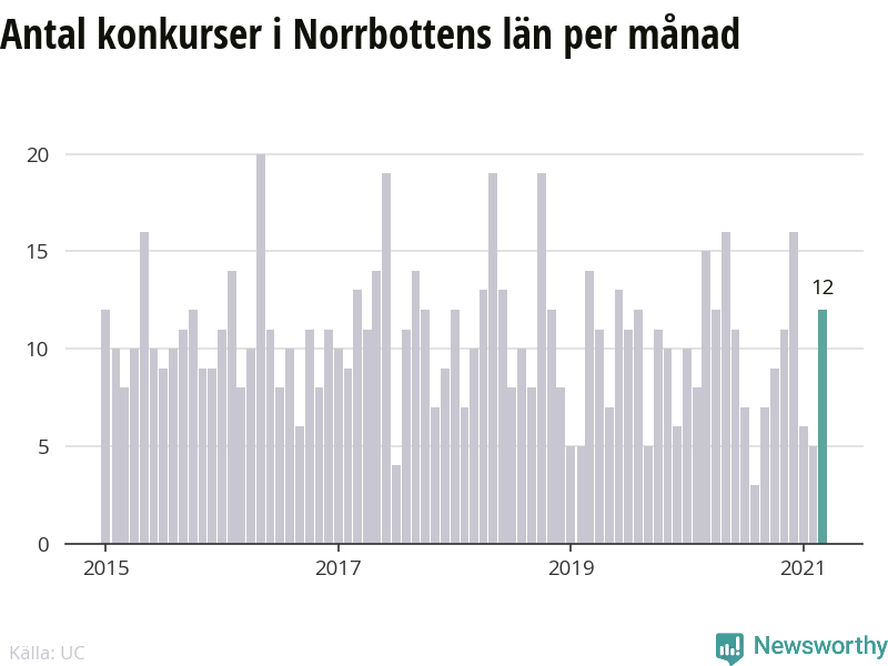 Under mars månad gick tolv bolag i konkurs i Norrbotten. Det är en tämligen normal nivå för den här tiden på året. I fjol noterades 15 konkurser under mars.