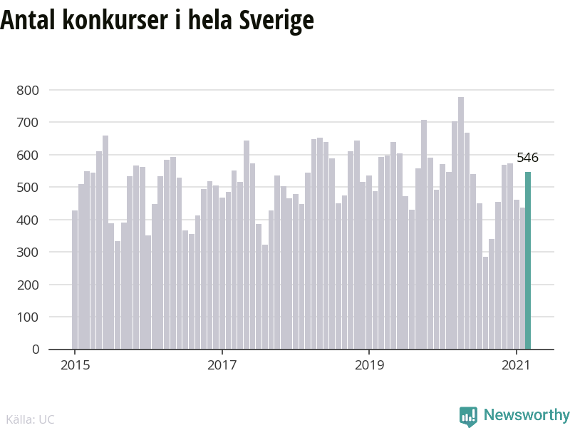 I hela Sverige gick 546 företag i konkurs i mars. Det är 156 färre än vid motsvarande tid i fjol (−22 procent). Jämför vi 2021 års samlade konkurser ser vi en nedgång med −17 procent.