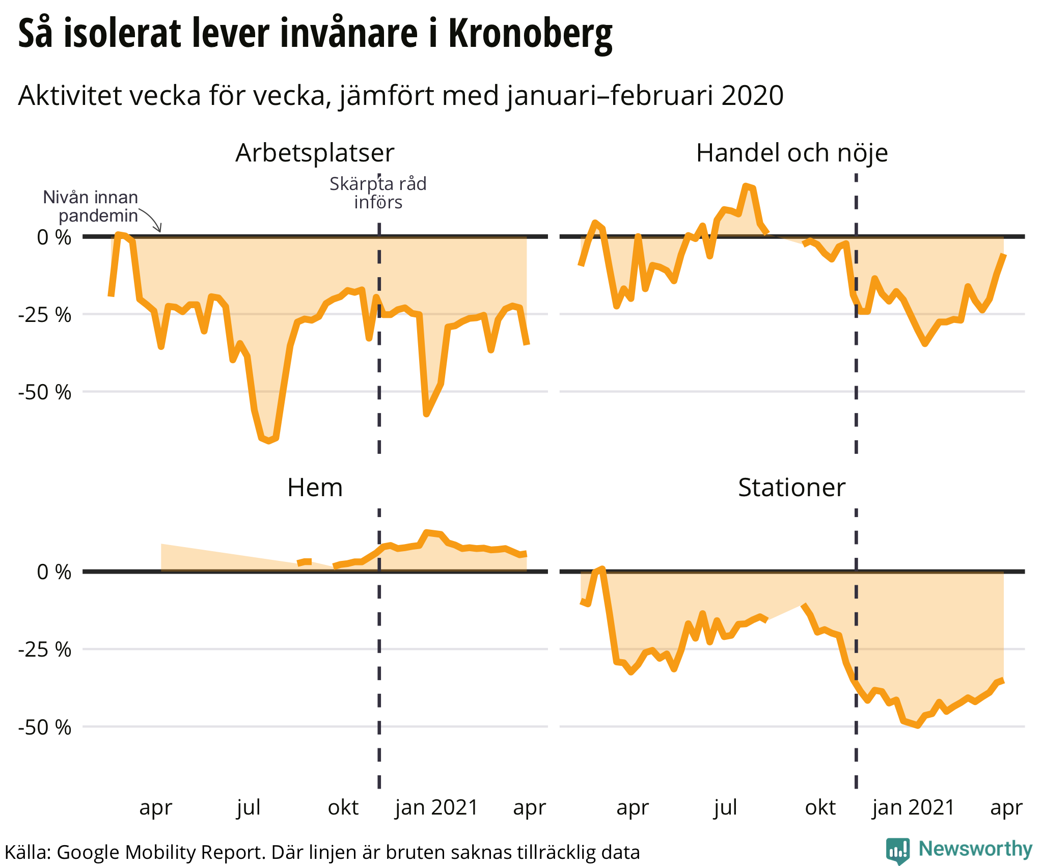 I Kronobergs län är utelivet just nu mindre aktivt än det var under april 2020, när första covid-19-vågen slog till. Men nya data från Google visar tecken på minskad isolering.