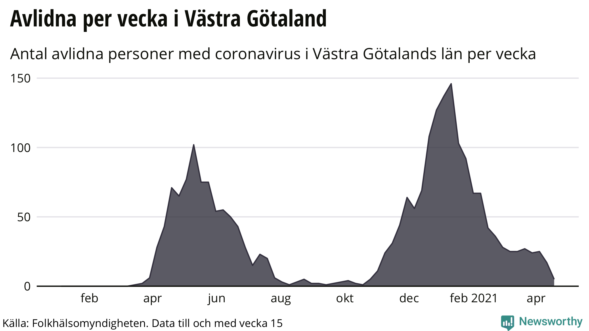 Under vecka 15 rapporterade Västra Götalands län att 5 personer avlidit med coronavirus (notera att statistiken över dödsfall är också på regionnivå).