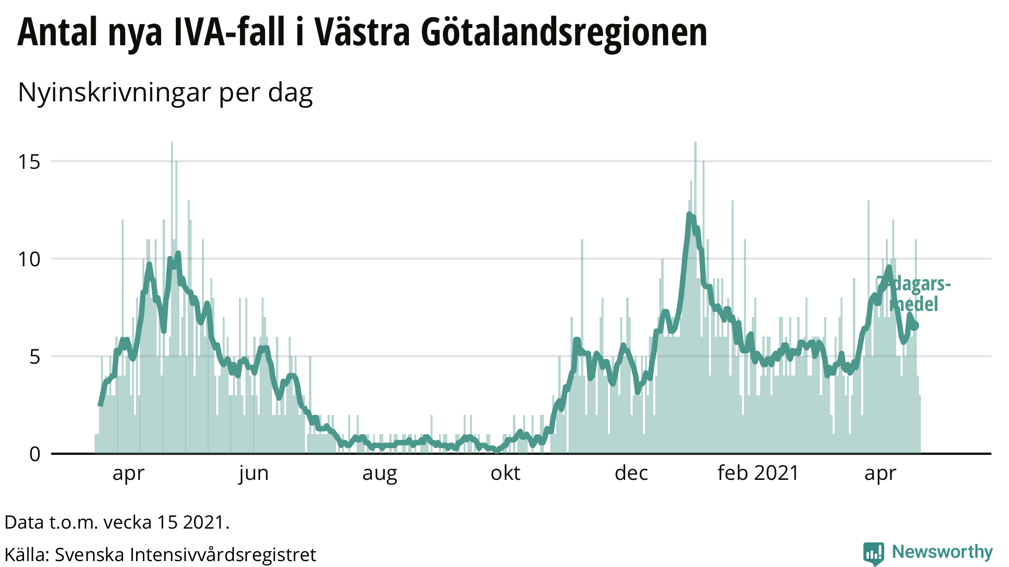 Den senaste veckan har 46 nya covid-19-patienter skrivits in i Västra Götalands län. Följande graf visar hur inskrivningarna har utvecklats över tid.