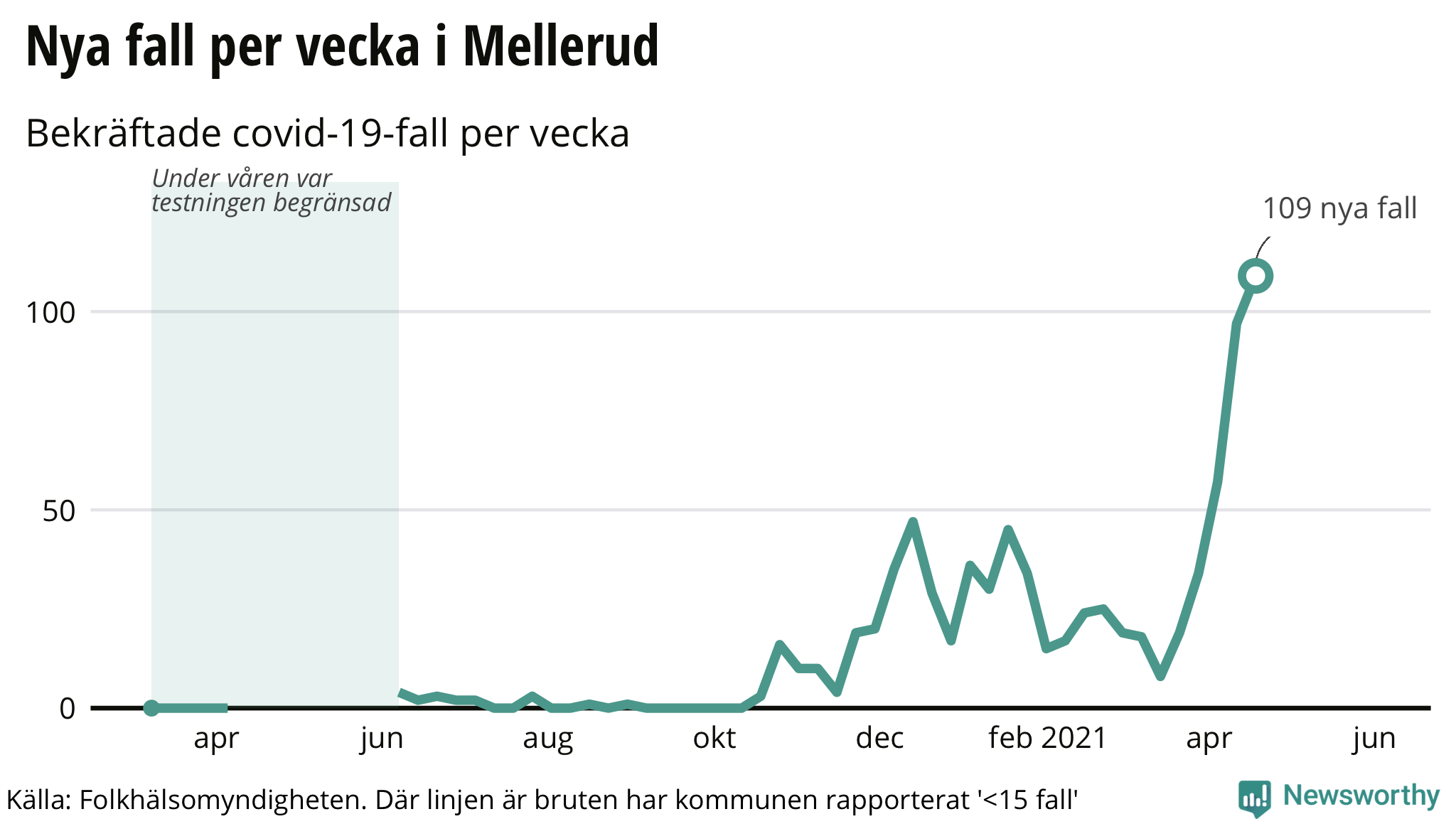 Den senaste veckan har 109 nya bekräftade fall av covid-19 rapporterats i Melleruds kommun. Det är en uppgång jämfört med den föregående veckan (+12 fall).
