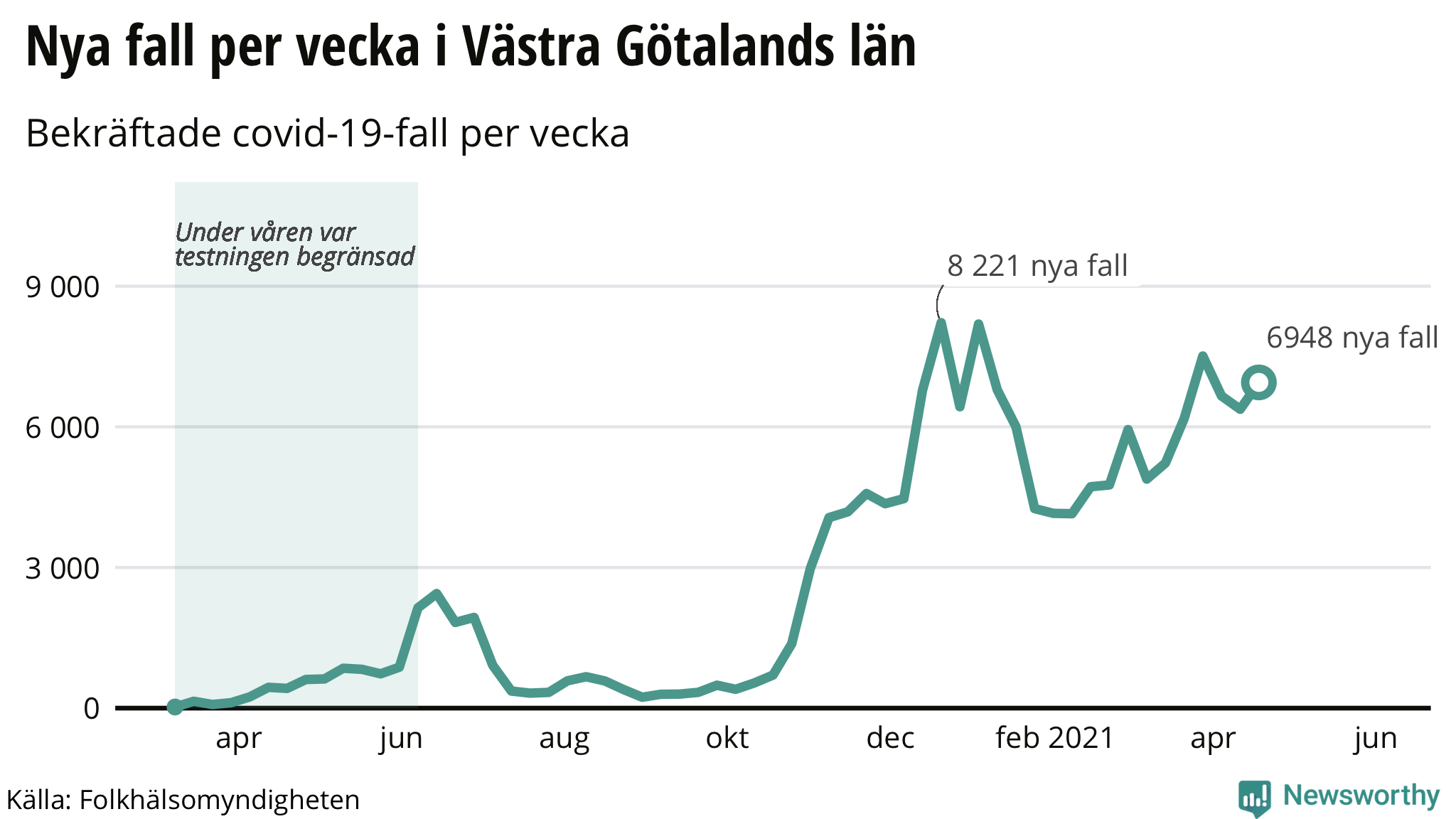 I hela Västra Götalands län rapporterades 6 948 nya fall den senaste veckan, vilket är något fler än under den föregående veckan (+9 procent).