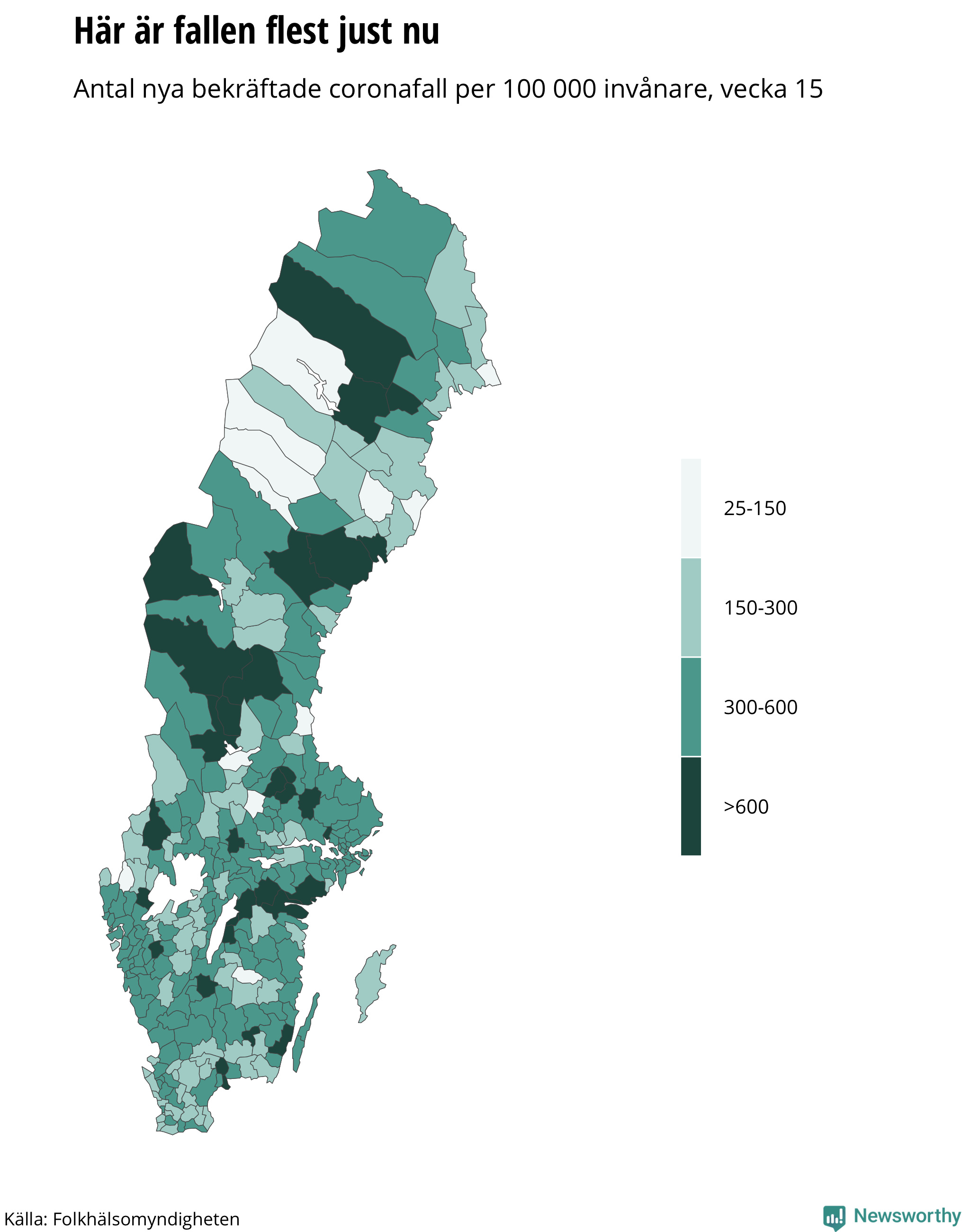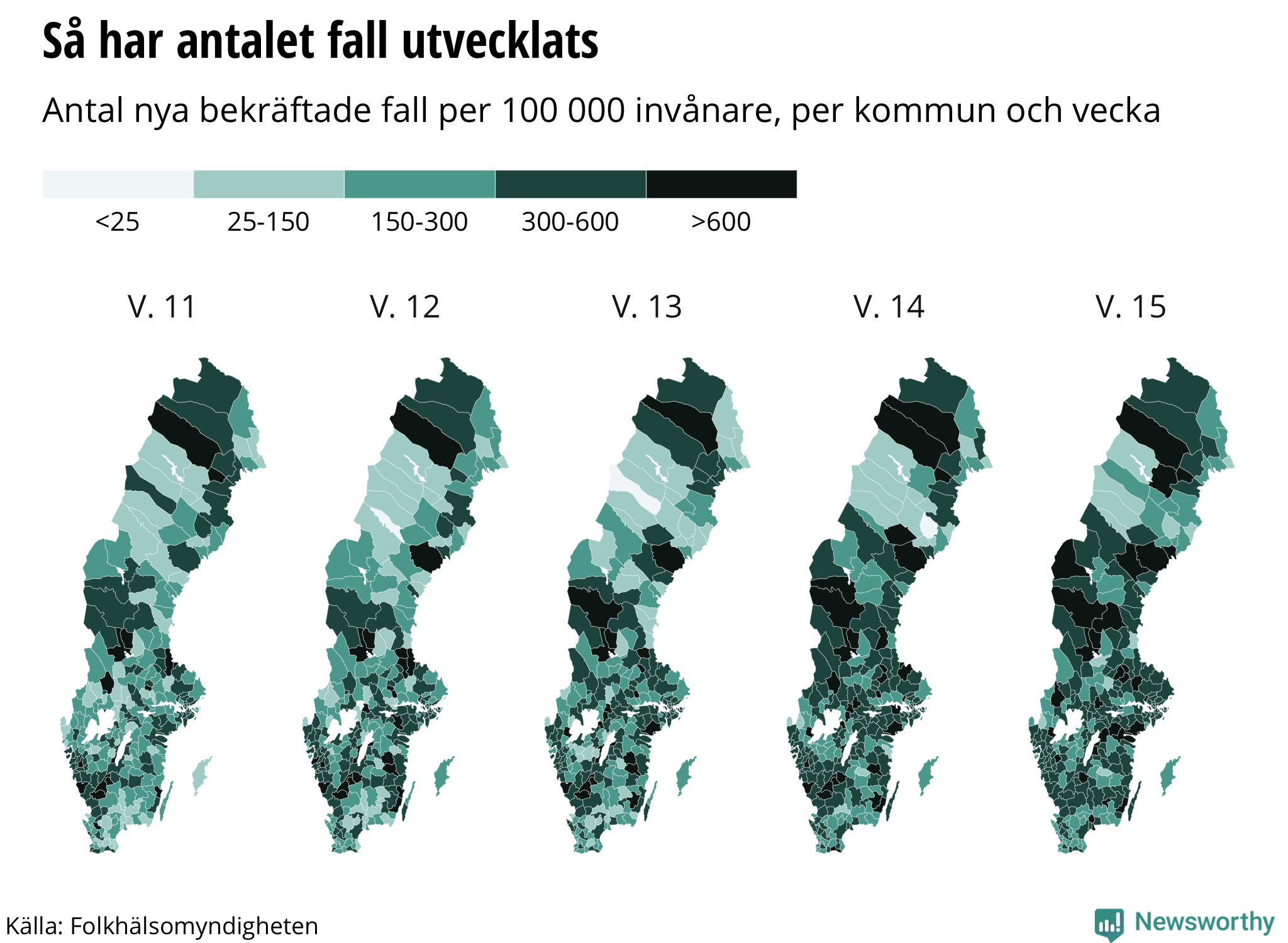 Newsworthy sammanställer varje vecka en rapport om coronaviruset och vaccinering i Sverige, kommun för kommun och län för län, baserat på statistik från Folkhälsomyndigheten.