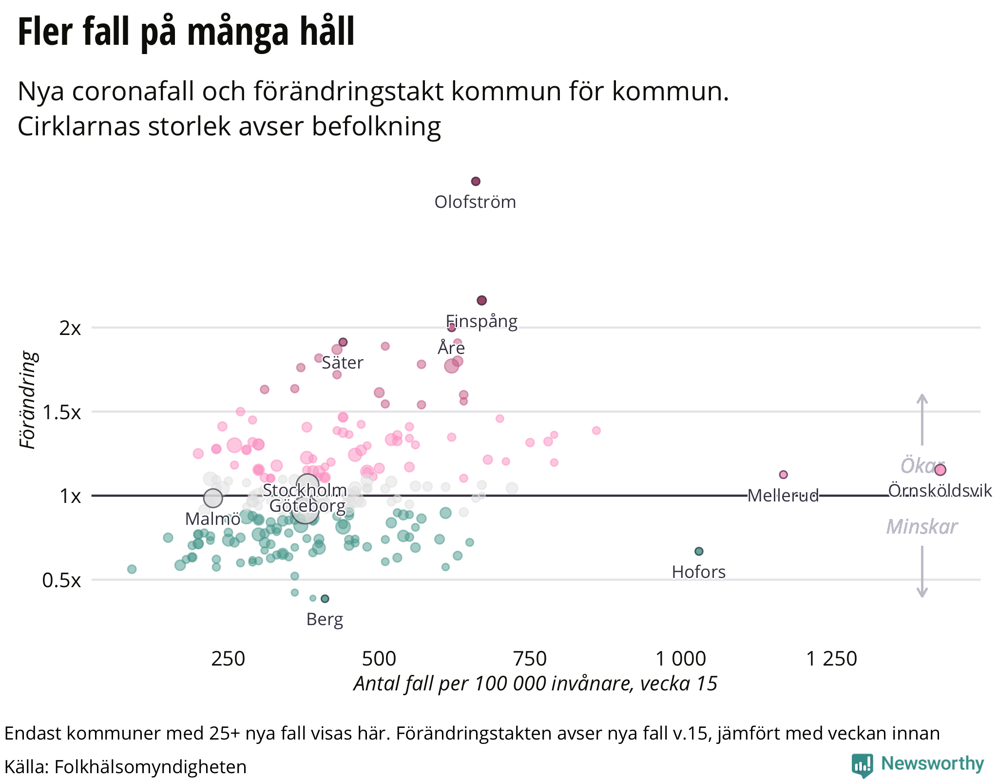 Grafen nedan visar utvecklingen jämfört med veckan innan kommun för kommun, för alla kommuner som rapporterat minst 25 fall.