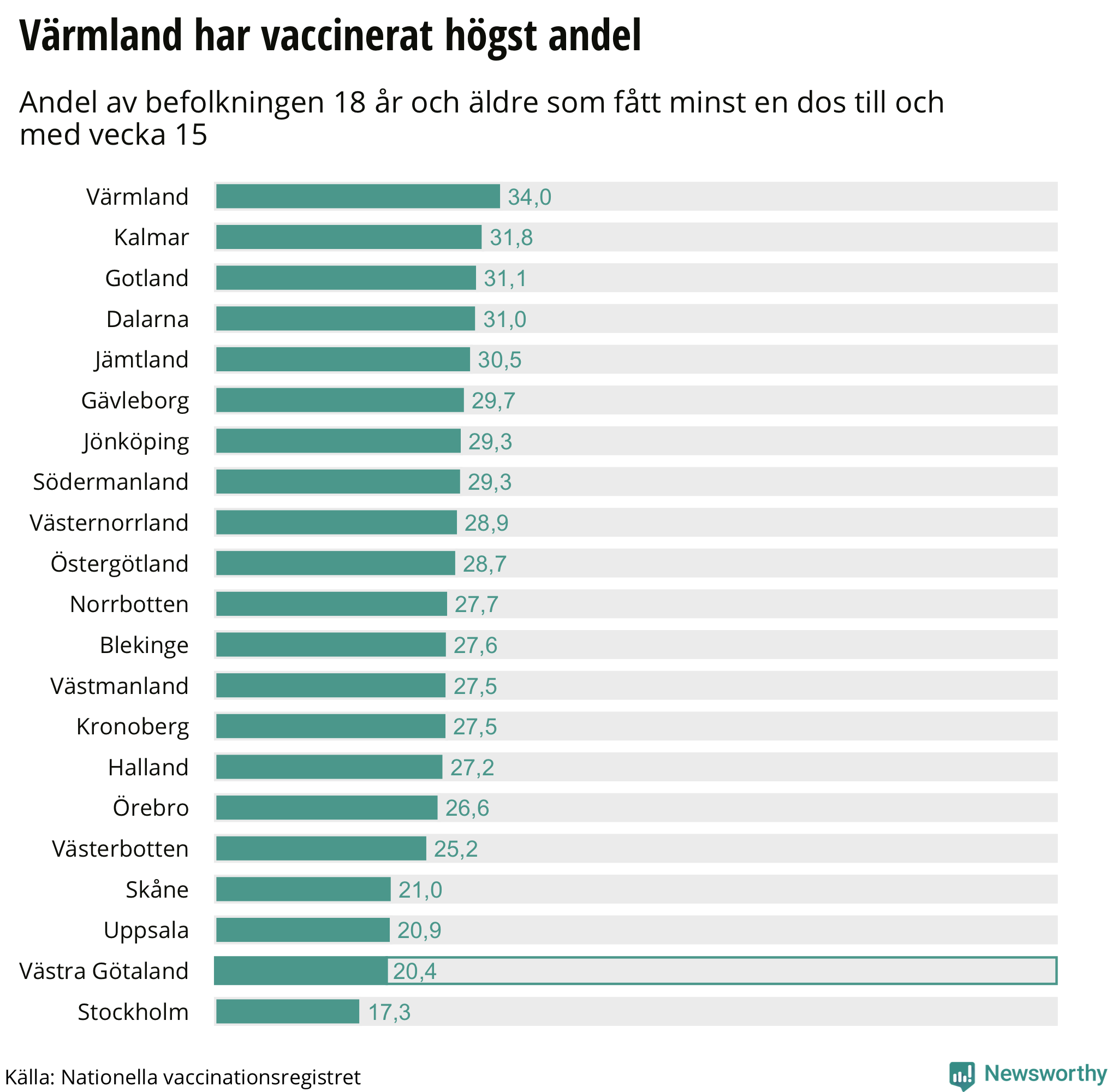 Totalt har 279 545 personer fått sin första vaccindos i Västra Götalands län fram till vecka 15.