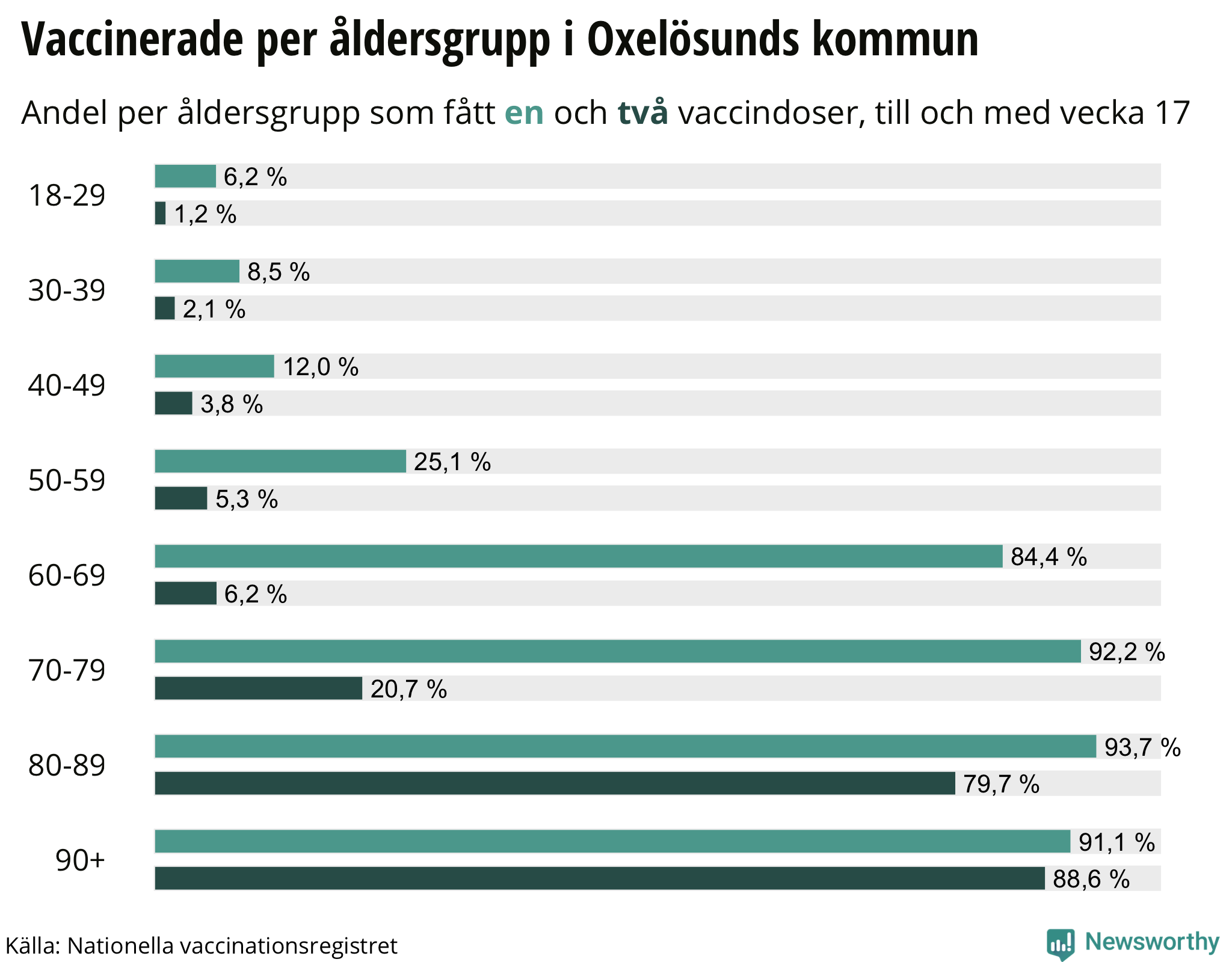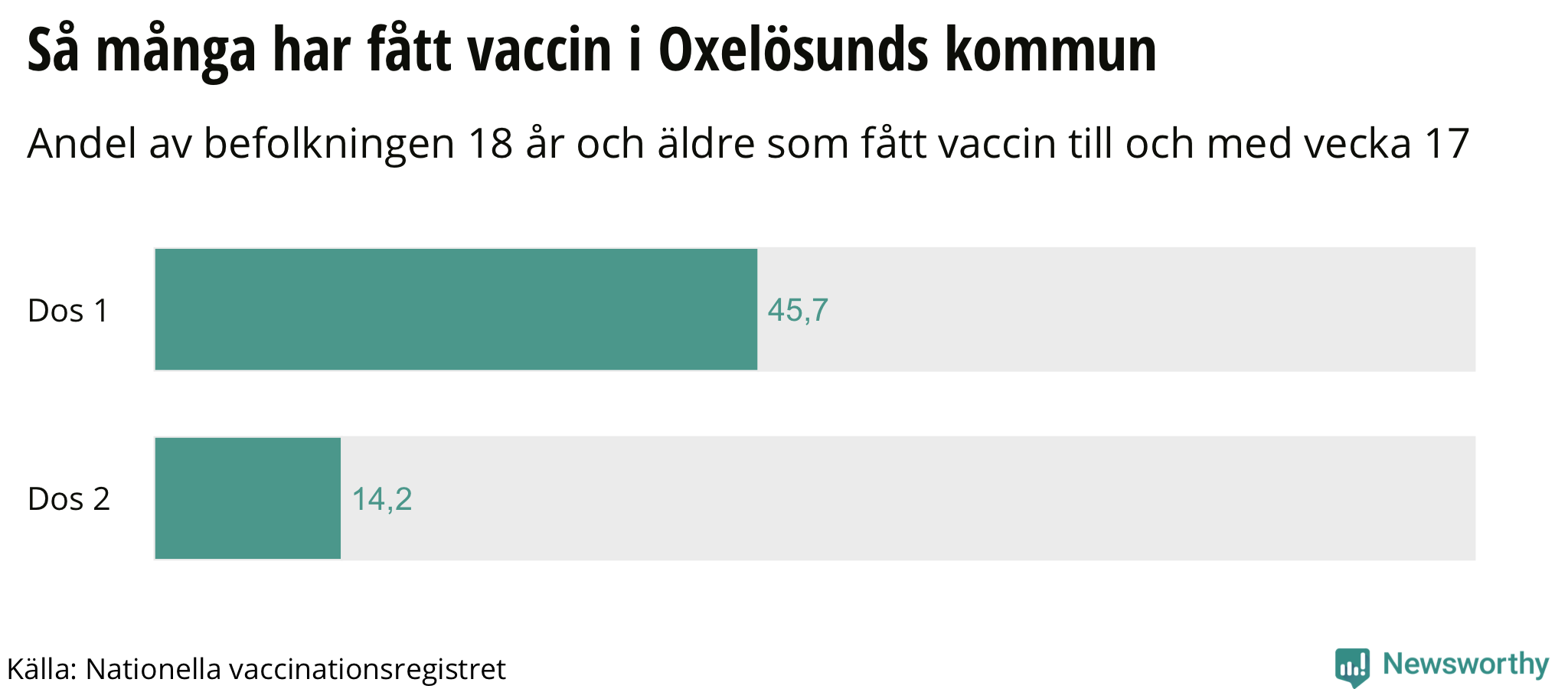 Totalt har 4 373 personer i Oxelösund fått sin första vaccindos fram till vecka 17, enligt Nationella vaccinationsregistret.