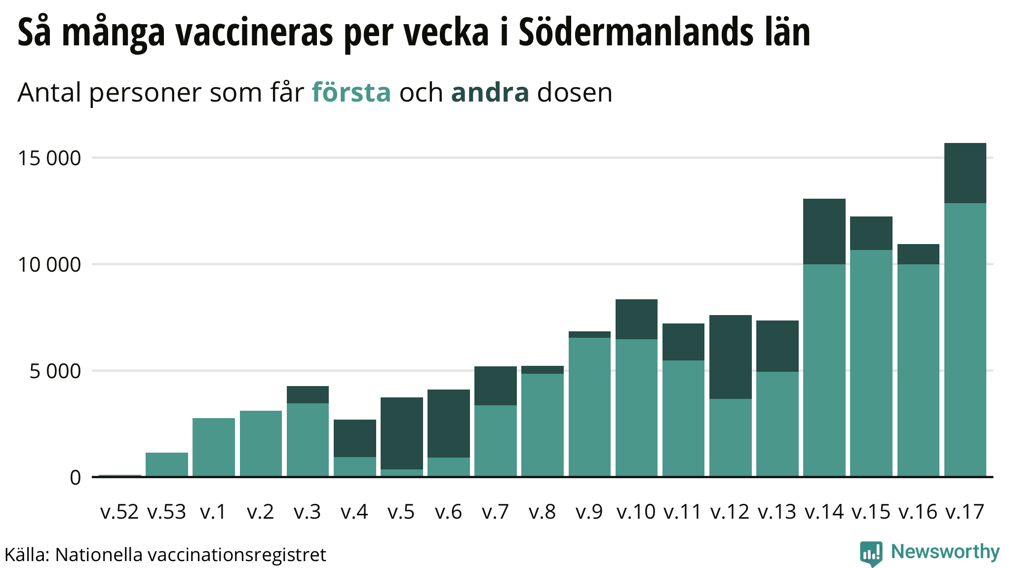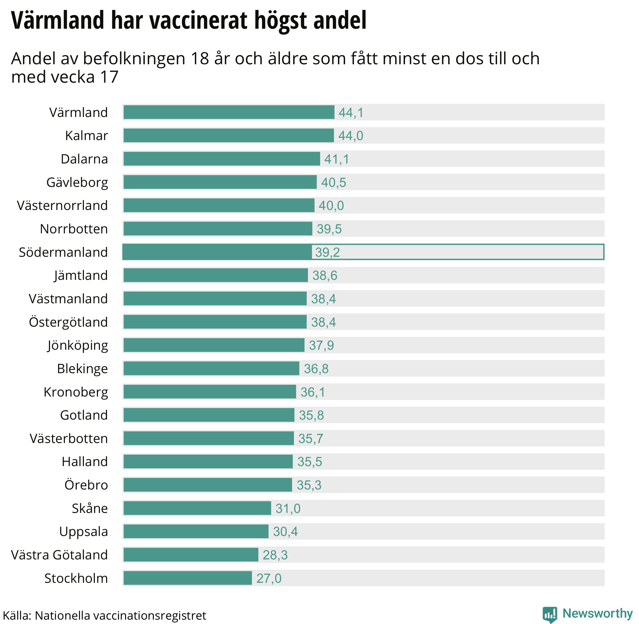 I hela Södermanlands län har 91 646 doser getts ut fram till vecka 17, vilket motsvarar 39 procent av den vuxna befolkningen.