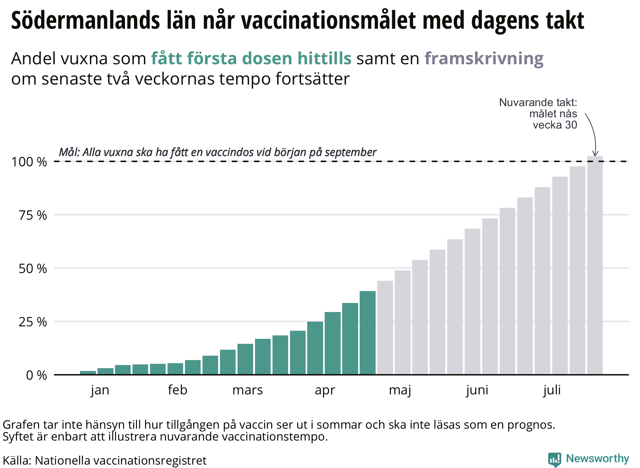I dagens tempo, baserat på antalet vaccinerade de senaste två veckorna, kommer alla vuxna i Södermanlands län att ha fått minst en vaccindos vid början på september.