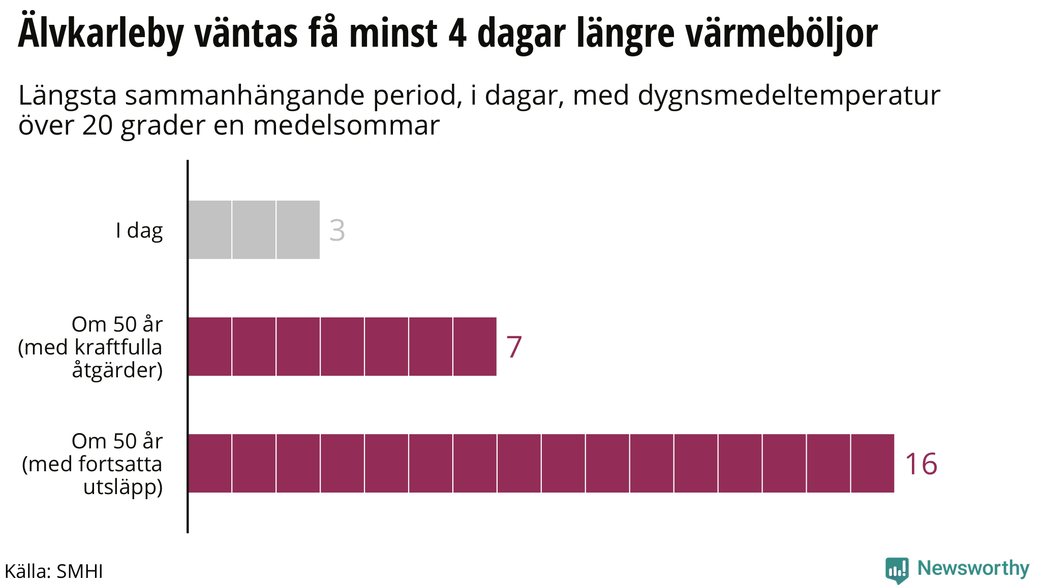 I takt med att klimatet förändras blir heta dagar allt fler. Om 50 år väntas Älvkarleby ha mellan en och två veckors sammanhängande värmebölja en typisk sommar. Kommunen står dessutom inför en extra utmaning, eftersom de väntas ha en högre andel äldre än de flesta andra kommuner. Det visar Newsworthys analys av data från SMHI och SCB.