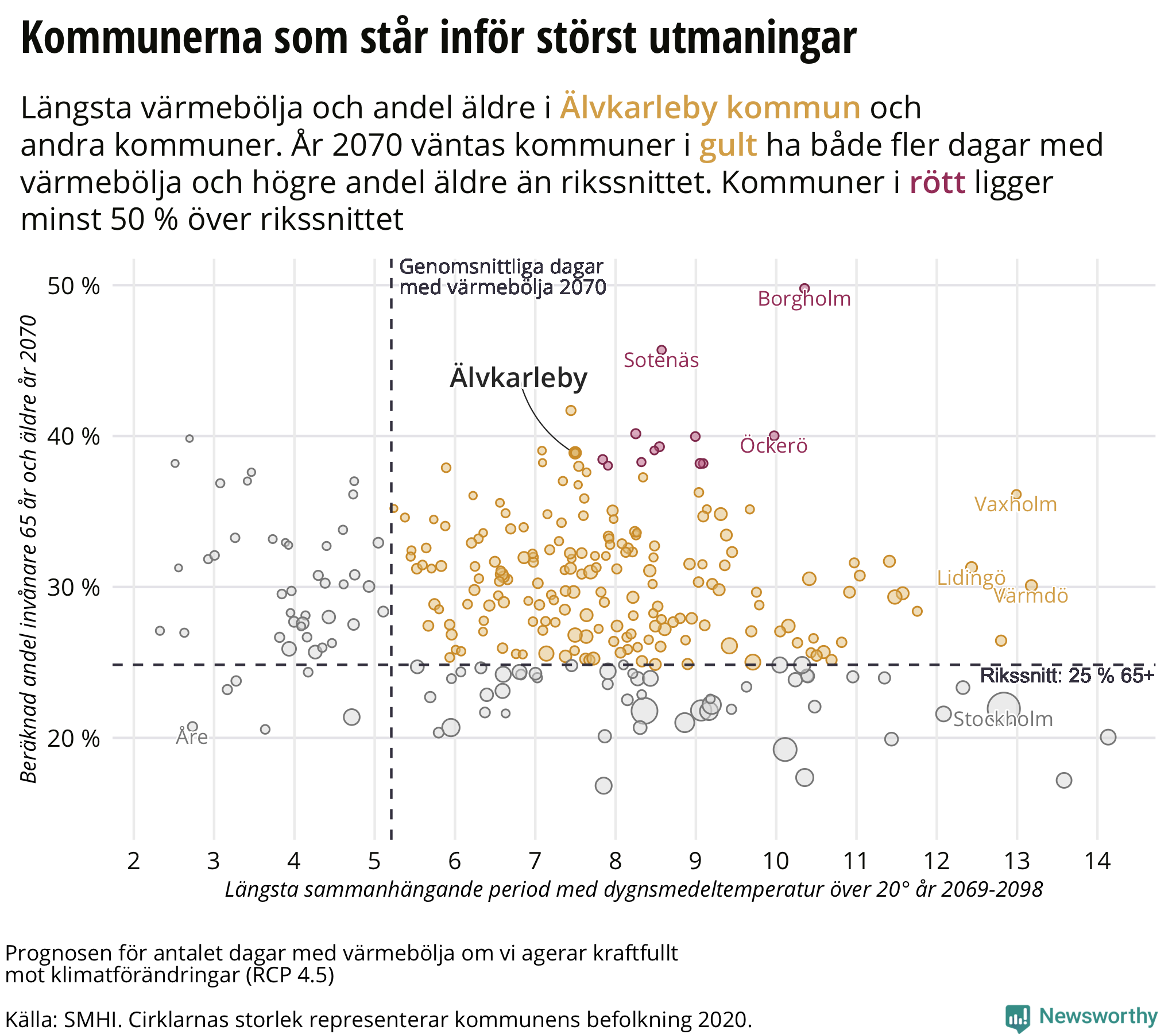 För att räkna på kommunerna som står inför störst utmaningar har vi multiplicerat det modellerade antalet dagar med värmebölja (för scenario RCP 4.5) med andelen invånare som är 65 år och äldre.