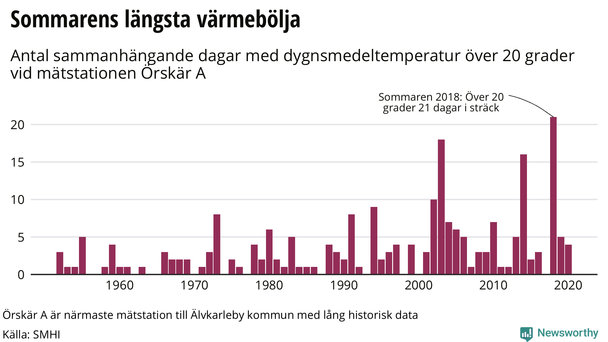 Vid mätstationen Örskär A har man uppmätt dygnsmedeltemperaturer sedan år 1941. Den längsta värmeböljan där var år 2018 då dygnstemperaturen låg över tjugo grader 21 dagar i sträck.