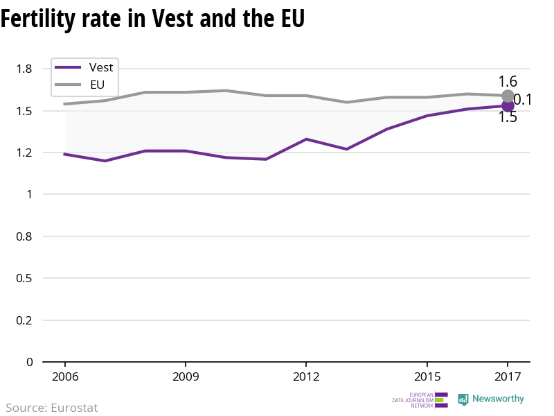Vest has a relatively low fertility rate compared with the rest of Europe, as each woman gives birth to on average just 1.53 children, based on the latest figures from 2017. However, in the last five years, fertility rates have risen, from 1.33 children per woman in 2012.
