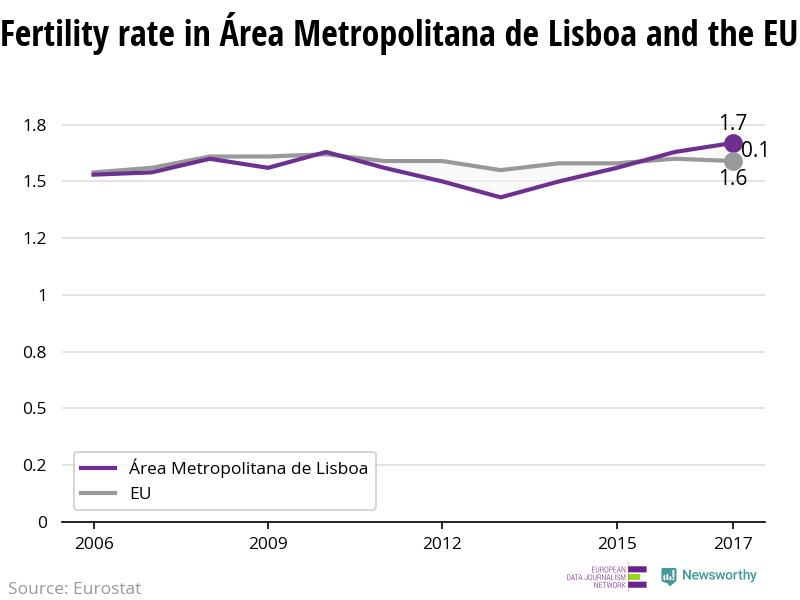 Área Metropolitana de Lisboa has a relatively high fertility rate compared with the rest of Europe, as each woman gives birth to on average 1.67 children, based on the latest figures from 2017, and in the last five years, fertility rates have risen further, from 1.5 children per woman in 2012.