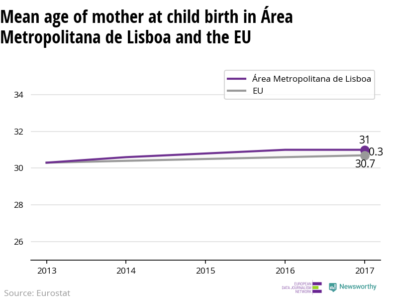 Women in Área Metropolitana de Lisboa have children on average when they are 31 years old, which is older than most regions in Europe.