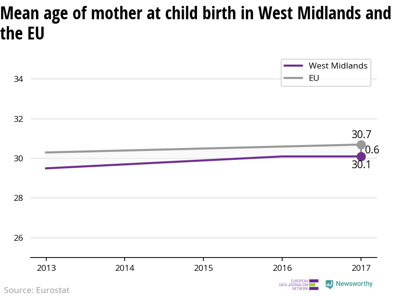 Women in West Midlands have children on average when they are 30.1 years old, which is younger than most regions in Europe.