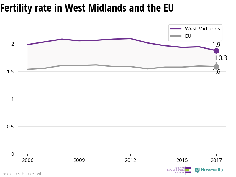 West Midlands has a relatively high fertility rate compared with the rest of Europe, as each woman gives birth to on average 1.88 children, based on the latest figures from 2017. However, in the last five years, fertility rates have fallen, from 2.1 children per woman in 2012.