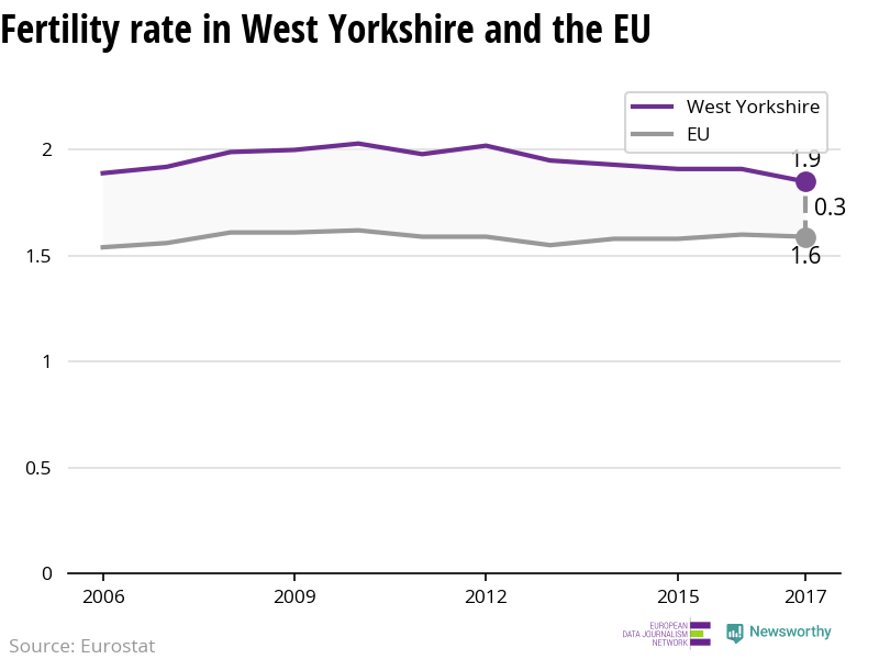 West Yorkshire has a relatively high fertility rate compared with the rest of Europe, as each woman gives birth to on average 1.85 children, based on the latest figures from 2017. However, in the last five years, fertility rates have fallen, from 2.02 children per woman in 2012.