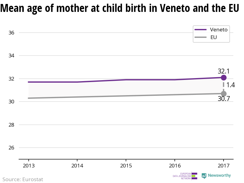 Women in Veneto have children on average when they are 32.1 years old, which is older than most regions in Europe.