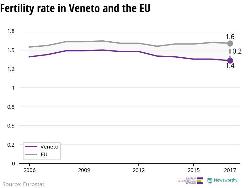 Veneto has a relatively low fertility rate compared with the rest of Europe, as each woman gives birth to on average just 1.36 children, based on the latest figures from 2017, and in the last five years, fertility rates have fallen, from 1.48 children per woman in 2012.