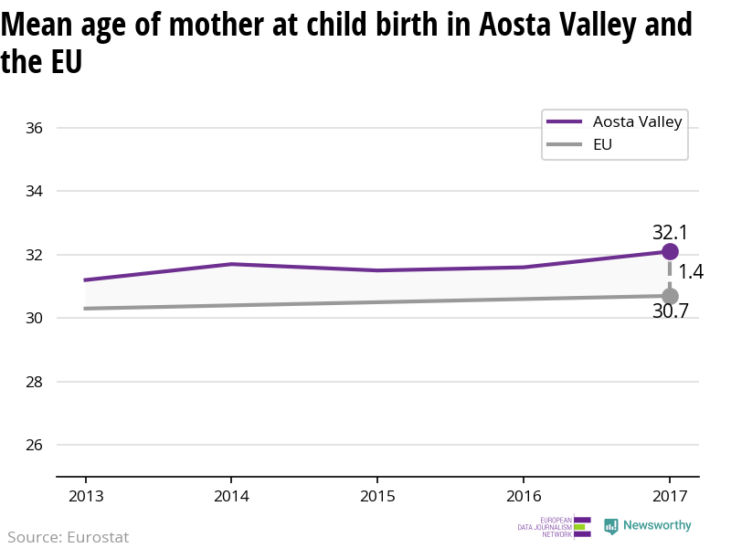 Women in Aosta Valley have children on average when they are 32.1 years old, which is older than most regions in Europe.