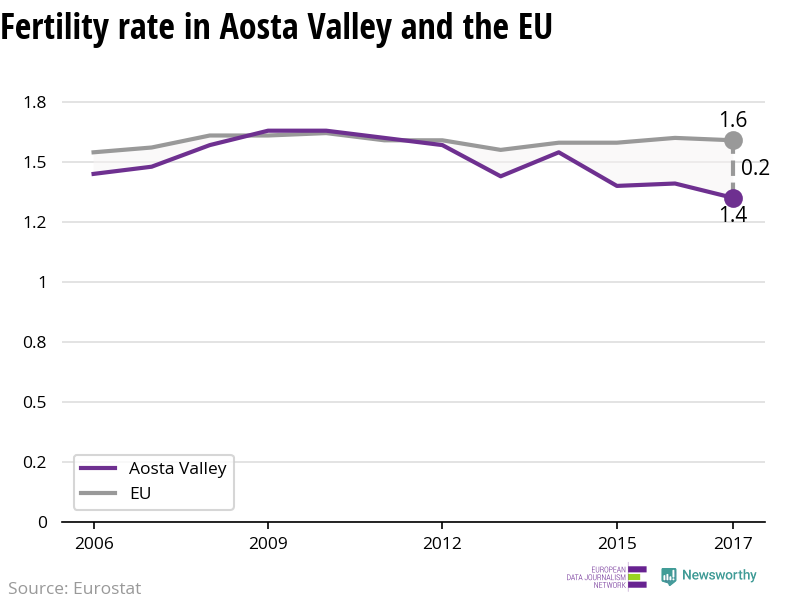 Aosta Valley has a relatively low fertility rate compared with the rest of Europe, as each woman gives birth to on average just 1.35 children, based on the latest figures from 2017, and in the last five years, fertility rates have fallen, from 1.57 children per woman in 2012.