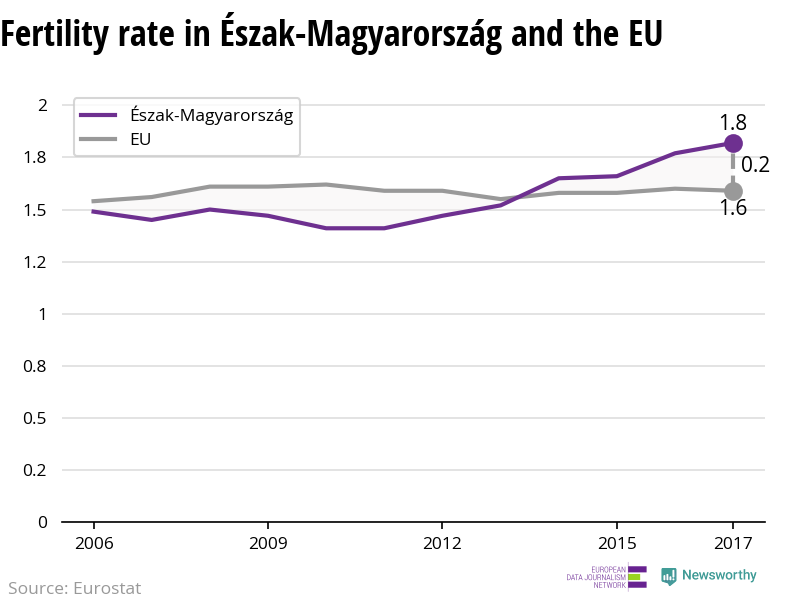 Each woman in Észak-Magyarország gives birth to on average 1.82 children, based on the latest figures from 2017. The fertility rate has increased from 1.47 children per woman in 2012, and this is the sixth years that fertility rates in the region have increased.