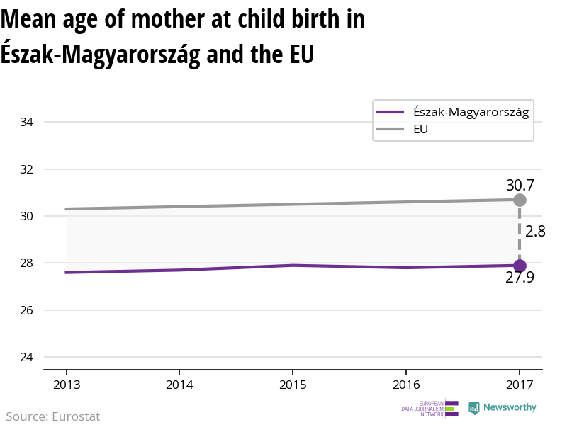 Women in Észak-Magyarország have children on average when they are 27.9 years old, which is younger than most regions in Europe.