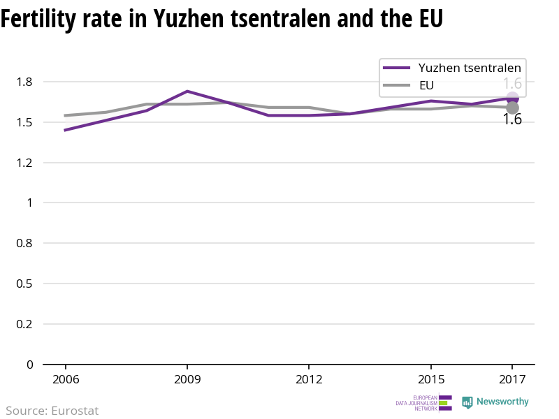 Yuzhen tsentralen has a fertility rate that is about the same as the European average, as each woman gives birth to on average 1.65 children, based on the latest figures from 2017. Since 2012, the fertility rate has increased from 1.54 children per woman.