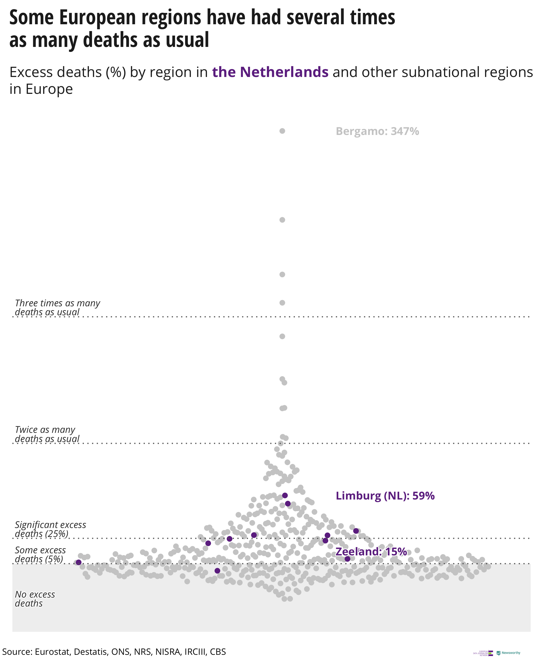 As Europe begins to get through the first coronavirus wave, we can start to get a sense of which parts of the continent have been hit hardest – and which have been unaffected. 5 out of 12 regions in Netherlands have had significant excess deaths during the coronavirus pandemic, which is more than other countries in Europe. Zeeland is not among them.