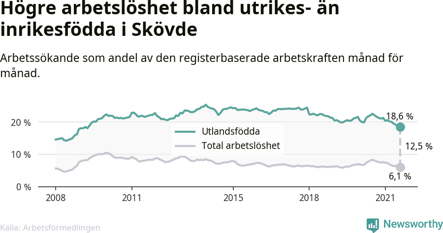 Skillnaden i arbetslöshet mellan utrikesfödda och hela befolkningen är 12,5 procentenheter i Skövde. Det är en betydligt mindre skillnad än för ett år sedan (−1,6 procentenheter).