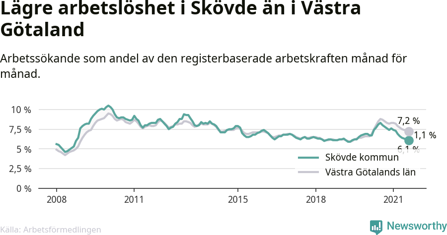 Så utvecklas arbetslösheten i Skövde kommun.