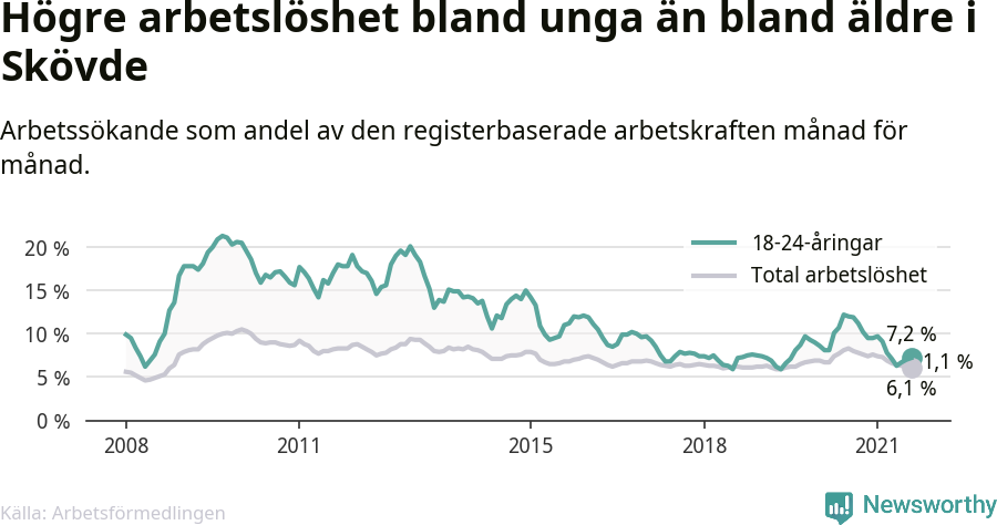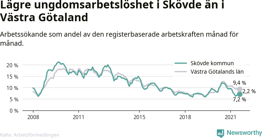 Precis som den totala arbetslösheten ligger ungdomsarbetslösheten i Skövde lägre än i Västra Götaland som helhet. Skillnaden mellan kommunen och länet är 2,2 procentenheter.