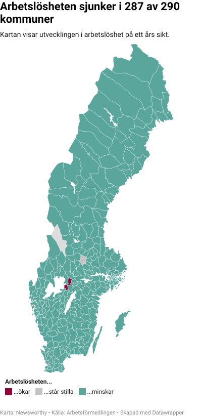 I riket som helhet sjönk arbetslösheten i augusti jämfört med året innan (−1,4 procentenheter) och ligger nu på 7,7 procent. 287 av 290 kommuner har lägre arbetslöshet i dag än för ett år sedan.