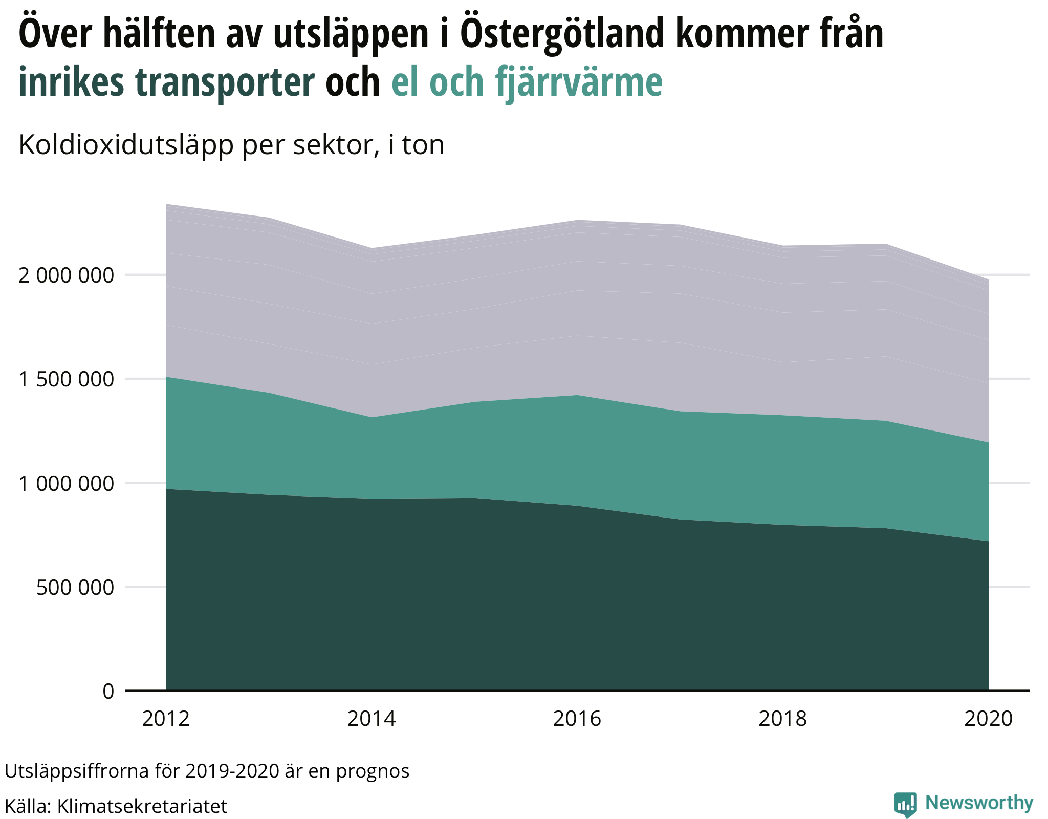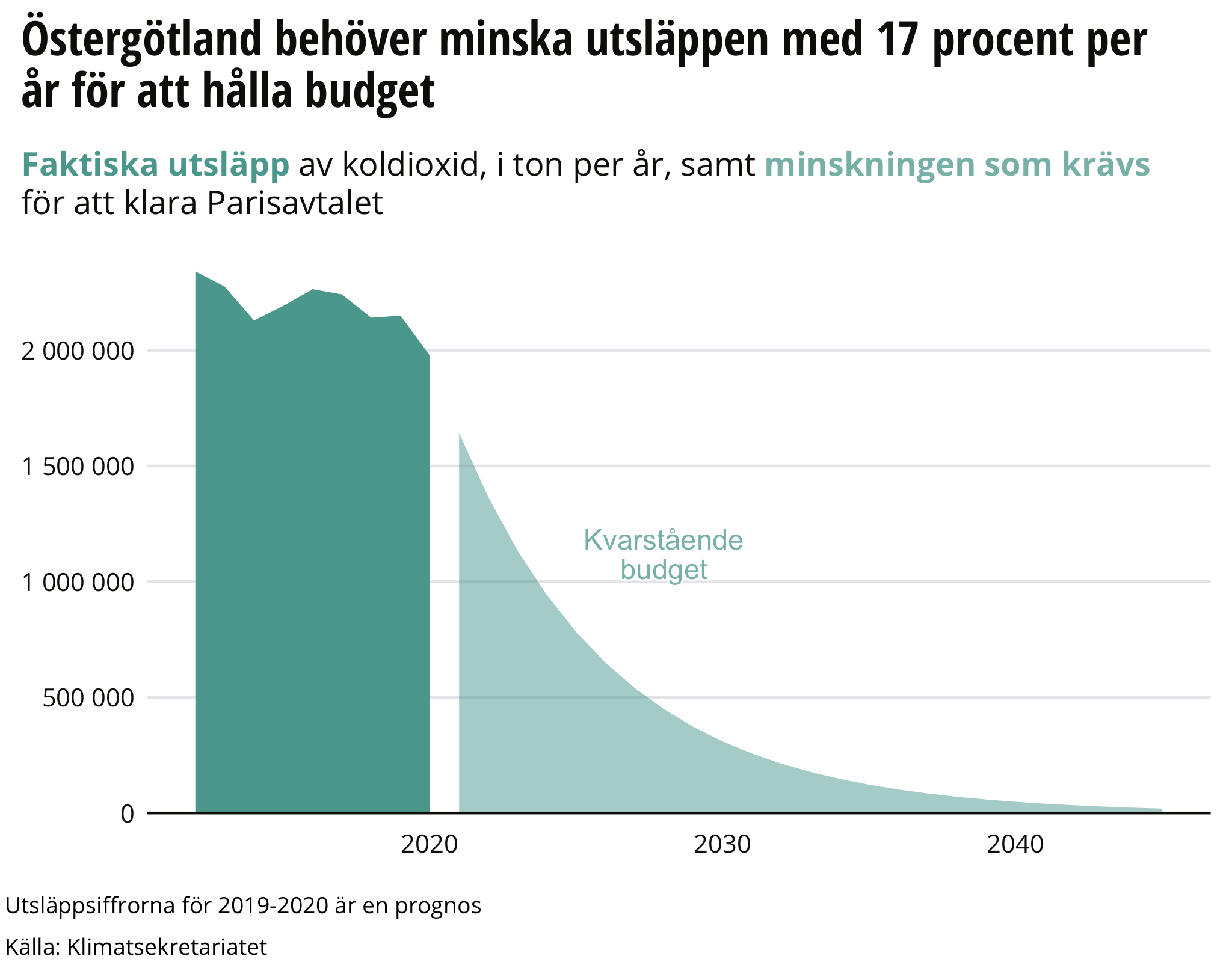 År 2020 beräknas Östergötland släppa ut omkring 2 miljoner ton koldioxid. Mellan åren 2015 och 2018 minskade utsläppen med 1 procent årligen, och utifrån den trenden tar koldioxidbudgeten slut om bara fem år. För att hålla budget skulle utsläppen behöva minska med 17 procent per år.